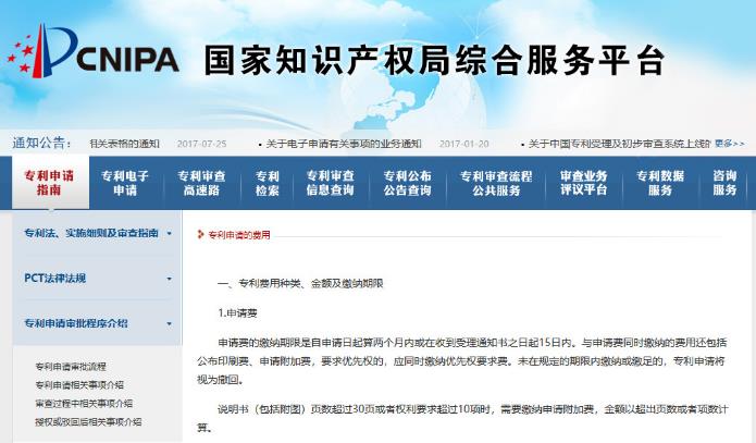 国家知识产权局专利申请费用标准