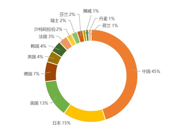 入榜前100名企业主要来自13个国家和地区,中国占比45%,其次为日本占比15%,美国占比13%,德国占比7%;英国和韩国各占比4%,法国占比3%,沙特阿拉伯、瑞士和芬兰各占比2%,挪威、丹麦和荷兰各占比1%。
