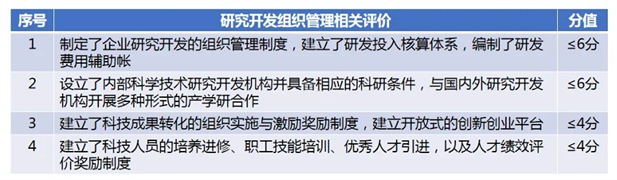 由技术专家根据企业研究开发与技术创新组织管理的总体情况,结合以下几项评价,进行综合打分: